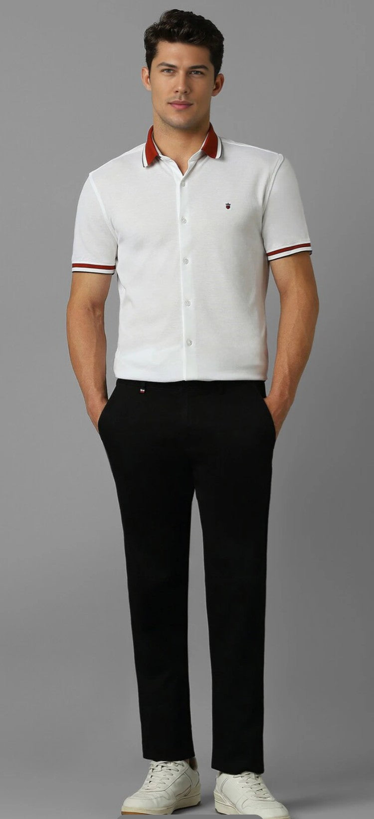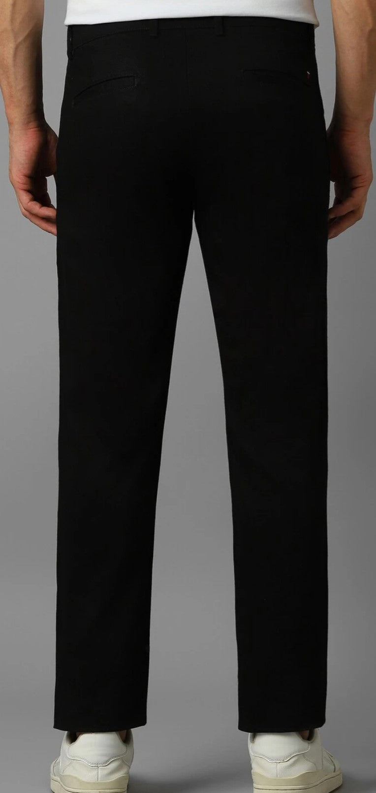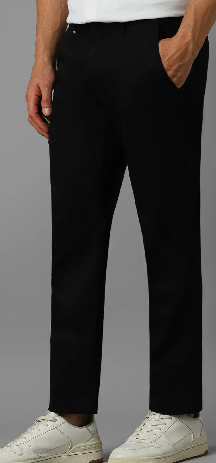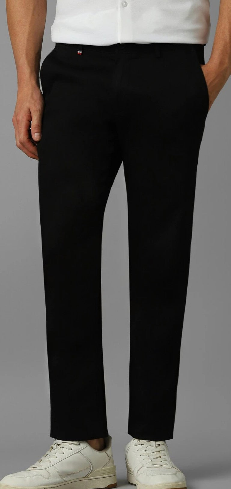 Experience effortless style with the Louis Philippe Sport black textured trousers. Crafted from a premium cotton and elastane blend, these slim tapered fit trousers offer unparalleled comfort while enhancing your silhouette. Designed for casual occasions, the flat front ensures a polished appearance, making them a versatile addition to your wardrobe.