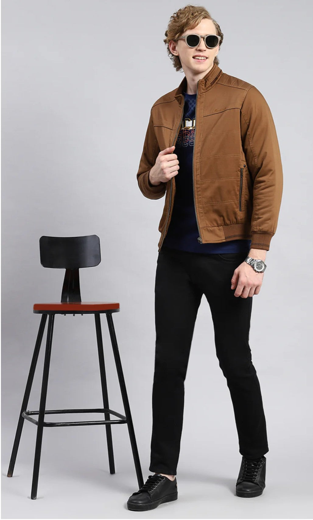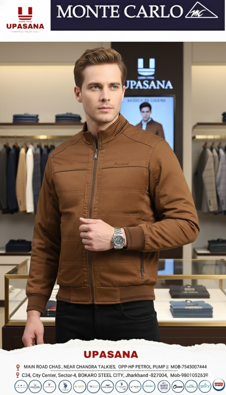 Men Brown Solid Stand Collar Full Sleeve Jackets