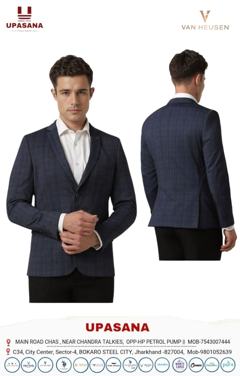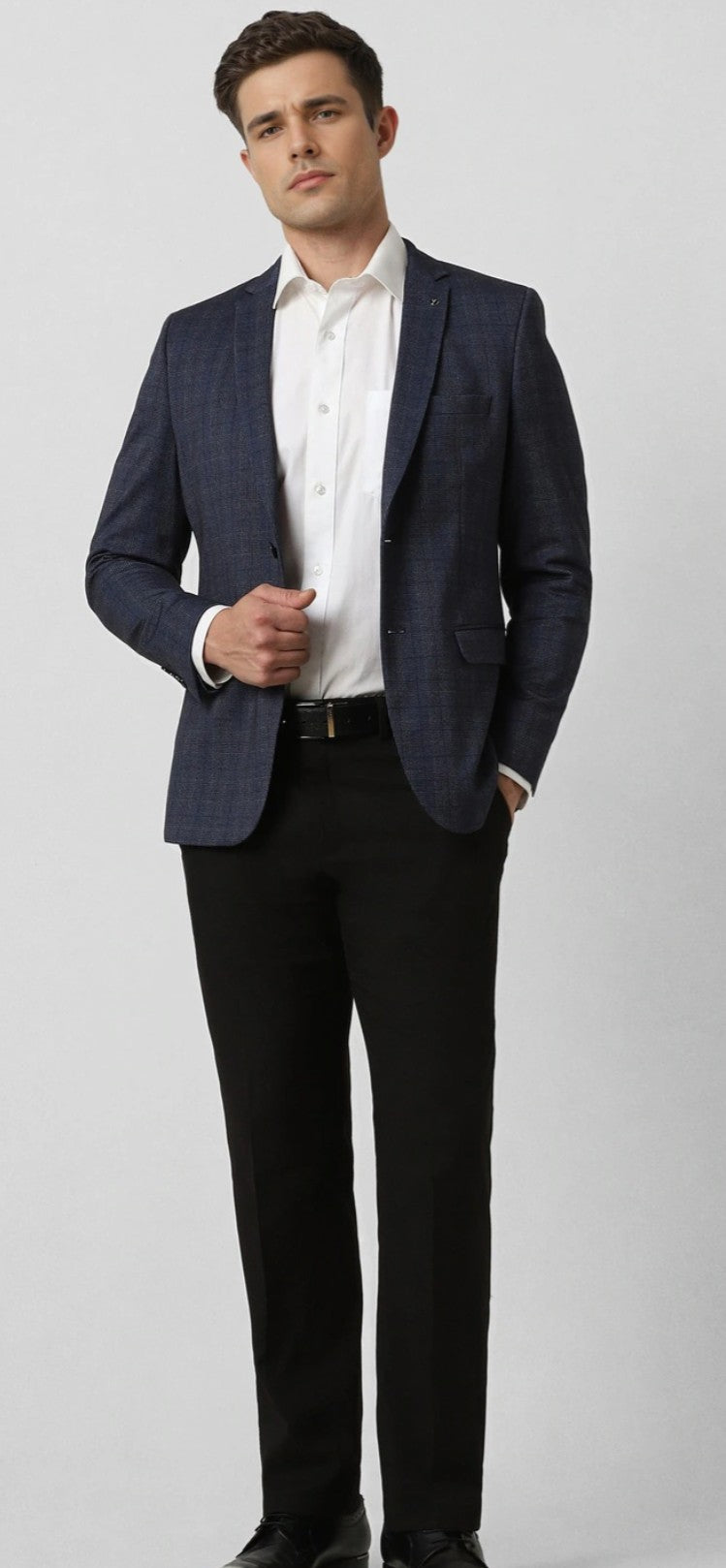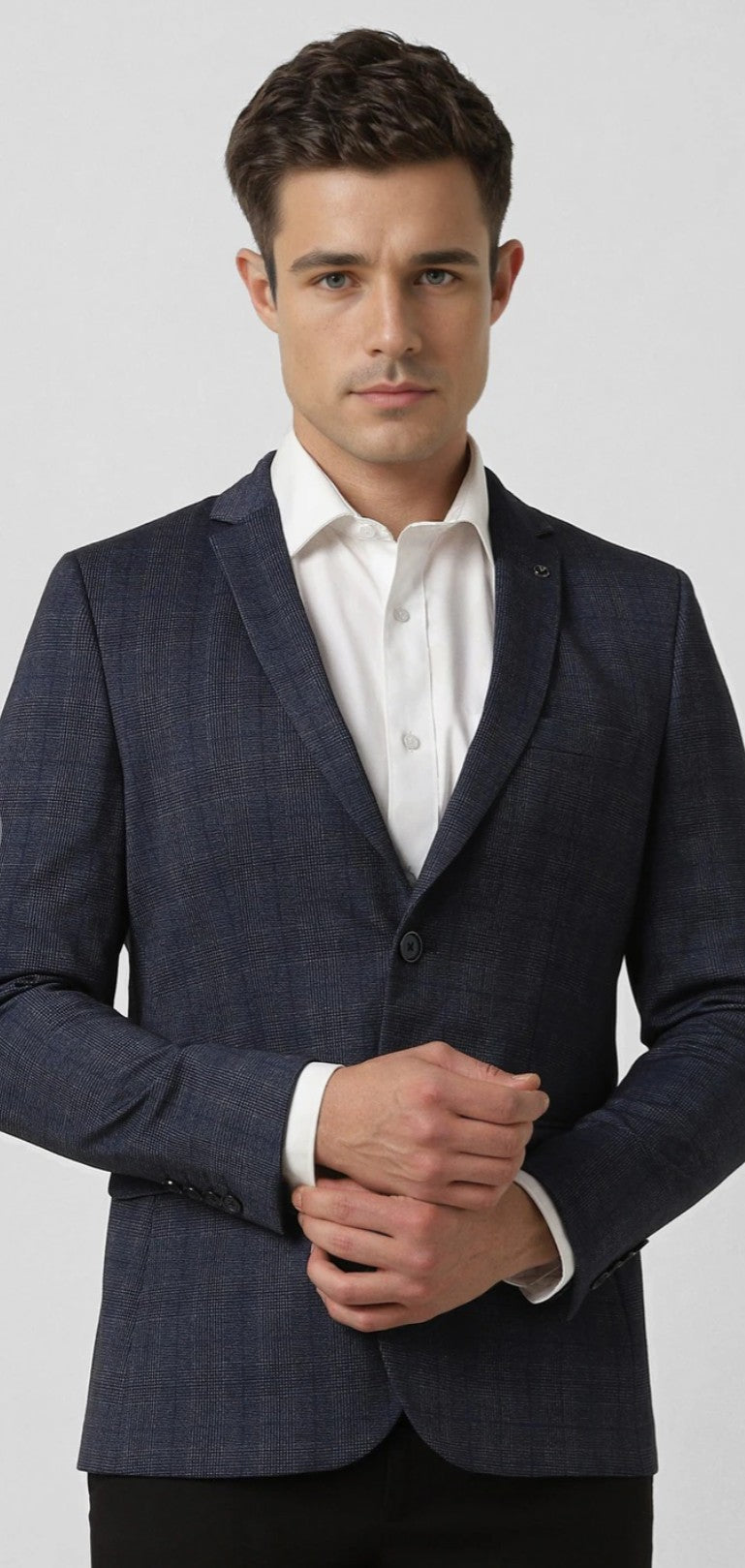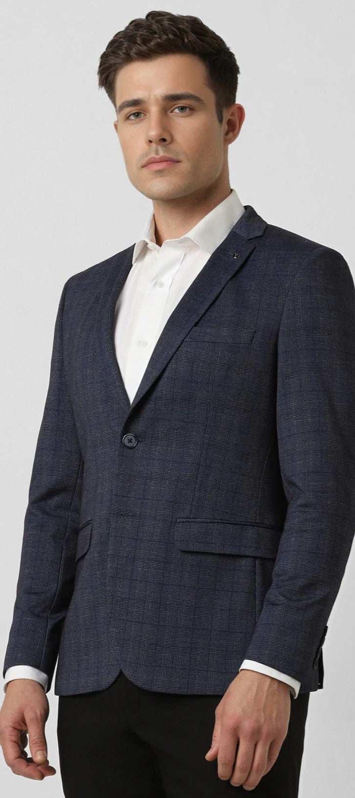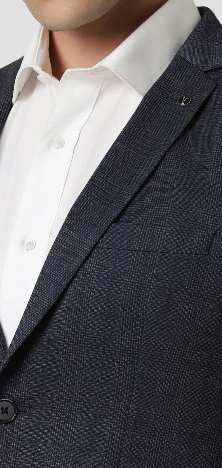 Elevate your formal wardrobe with the Van Heusen Ultra Slim Fit Blazer in Navy. Crafted from a premium blend of polyester, rayon, and spandex, this blazer features a modern check pattern and full sleeves for a sophisticated look. With its stylish two-button front, it is perfect for any formal occasion, ensuring you look sharp and polished.