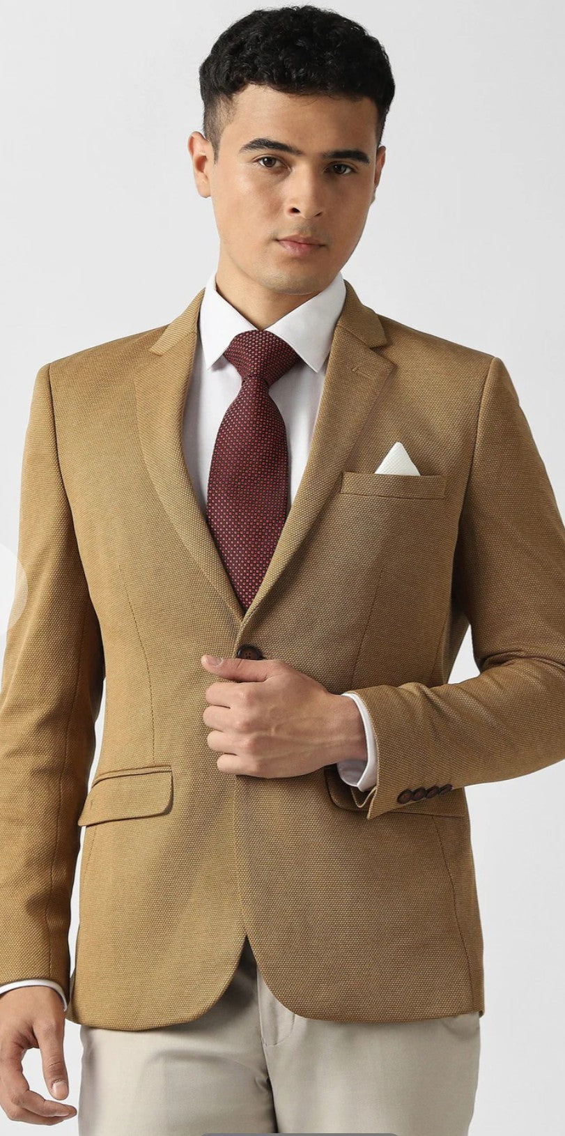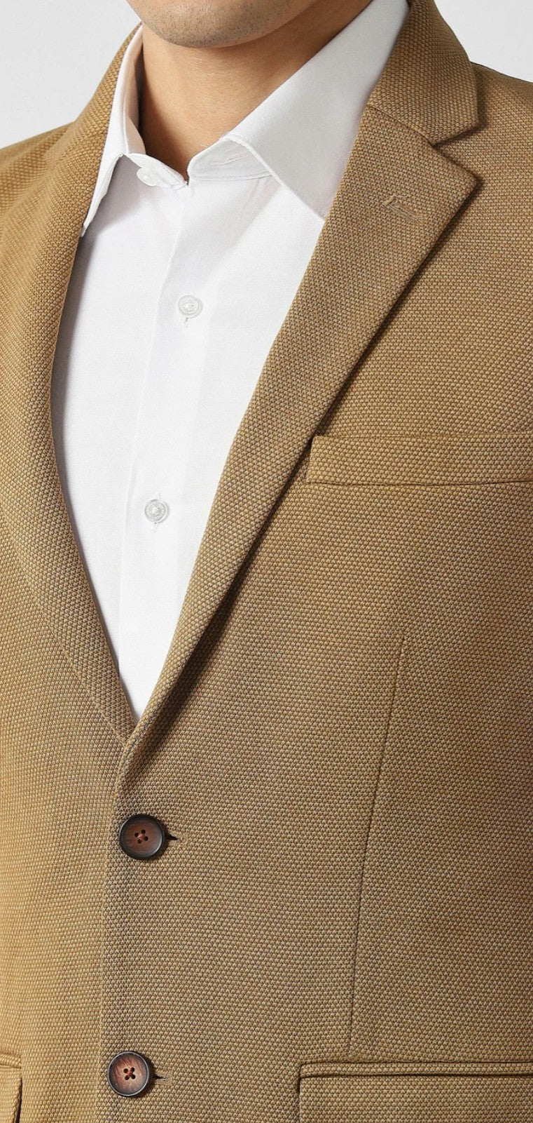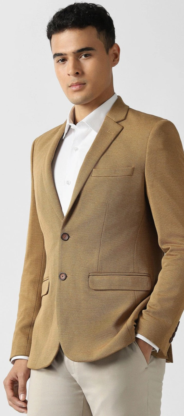 Elevate your formal wardrobe with the Van Heusen Move blazer in a sophisticated Khaki. This ultra-slim fit design features a textured pattern, crafted from a premium blend of polyester, rayon, and spandex for ultimate comfort and style.