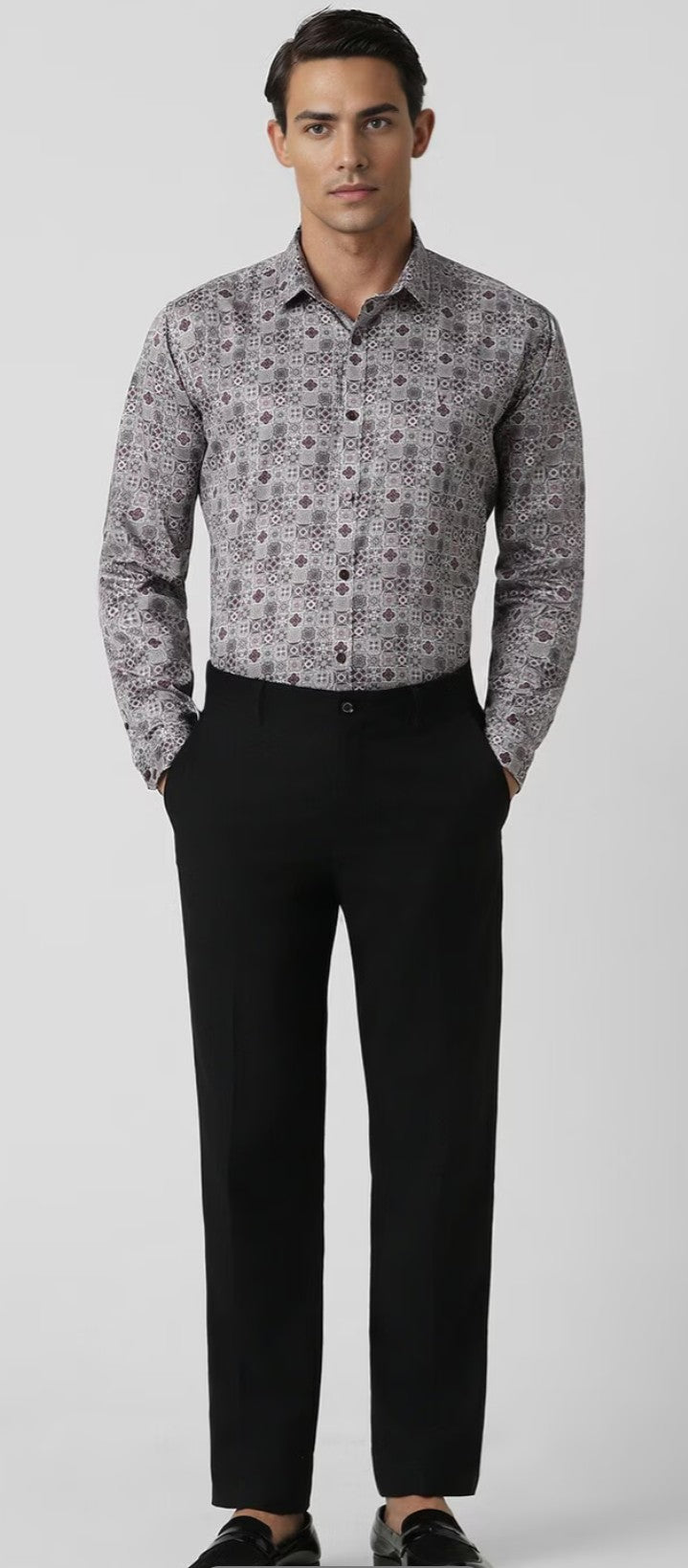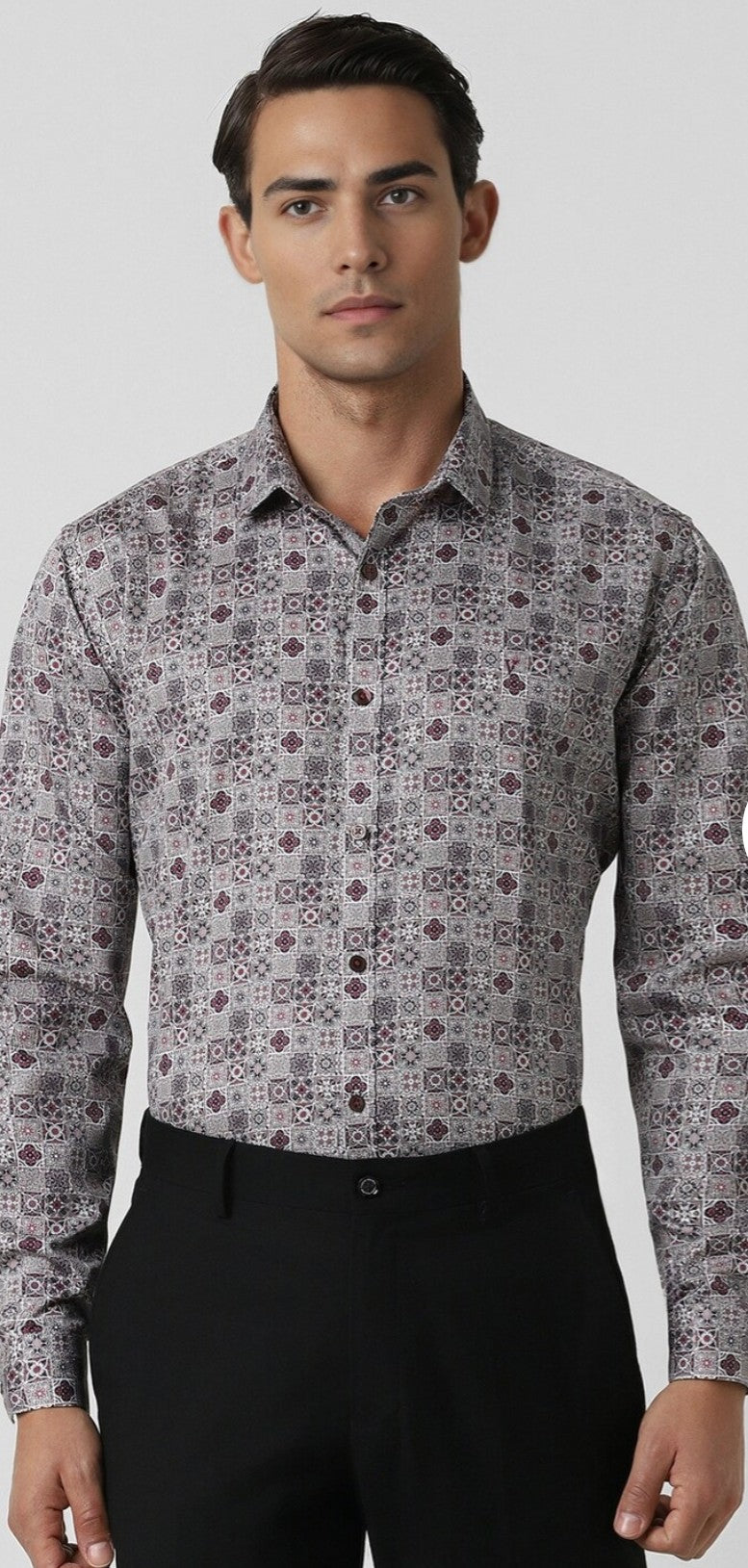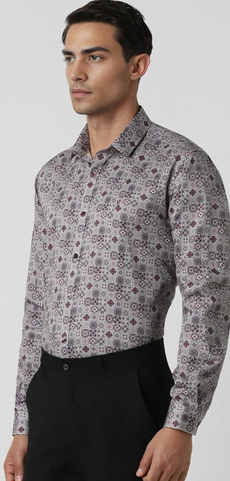 Elevate your party wardrobe with this V Dot grey slim-fit shirt. Crafted from breathable cotton, it features a stylish printed design and full sleeves, ensuring you make a statement without compromising on comfort. The sophisticated cut enhances your silhouette, perfect for social events. Pair it effortlessly with your favorite trousers for a look that exudes confidence and flair. Embrace elegance and stand out in every gathering with this essential addition.