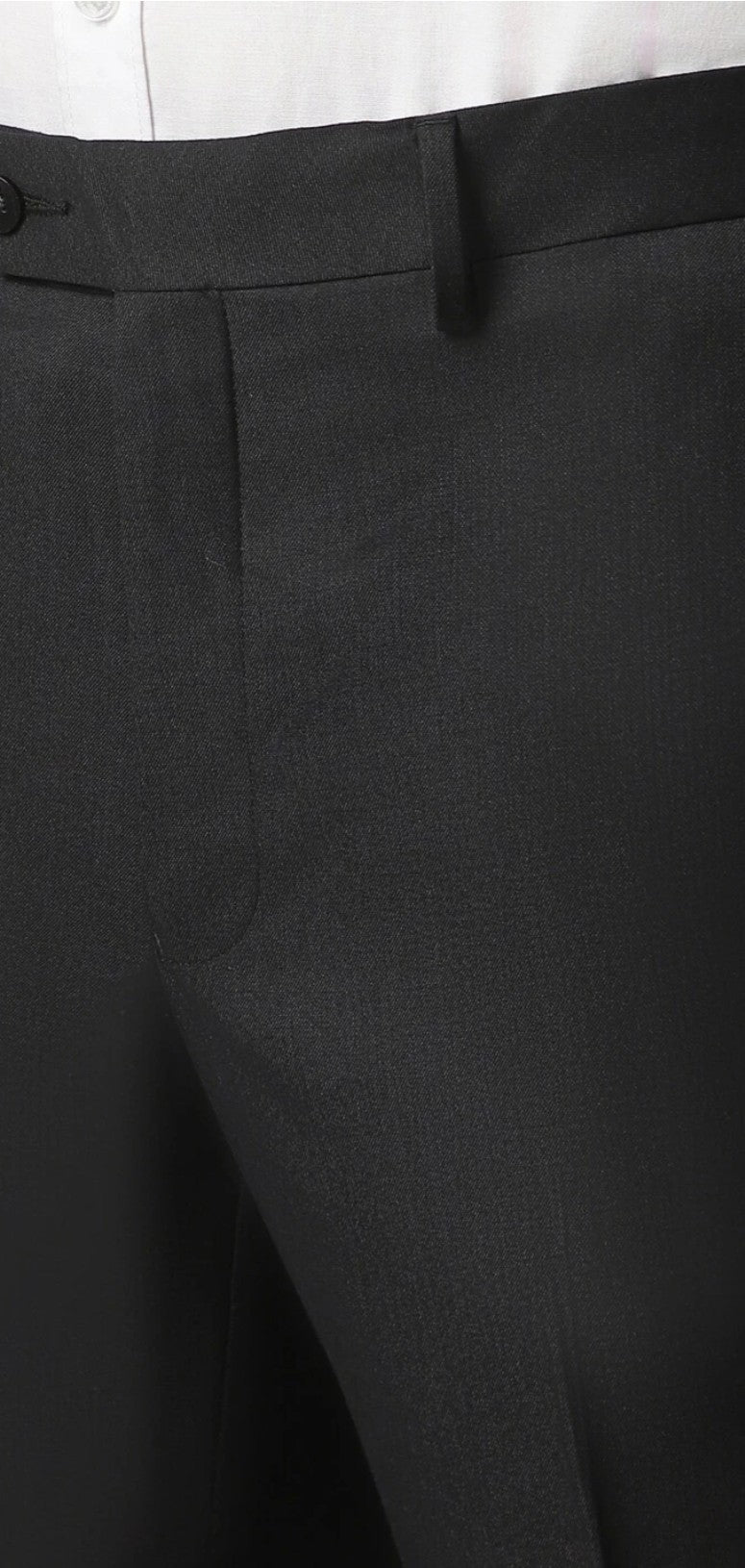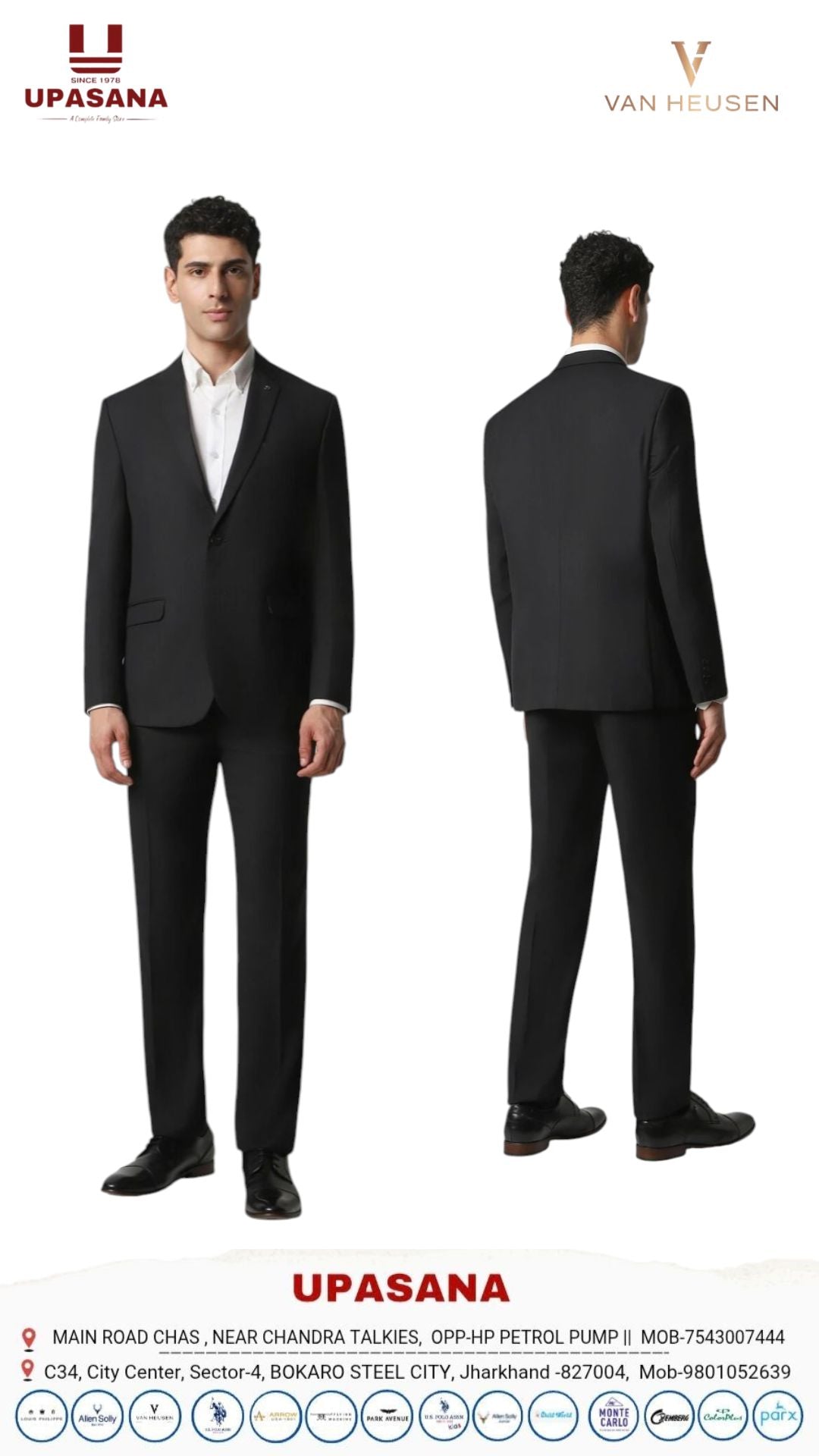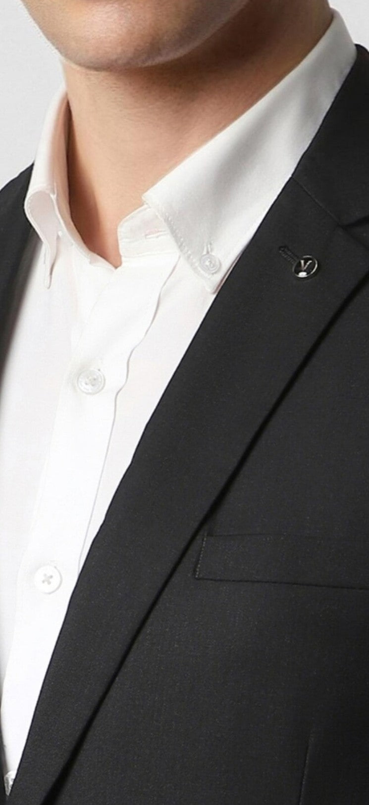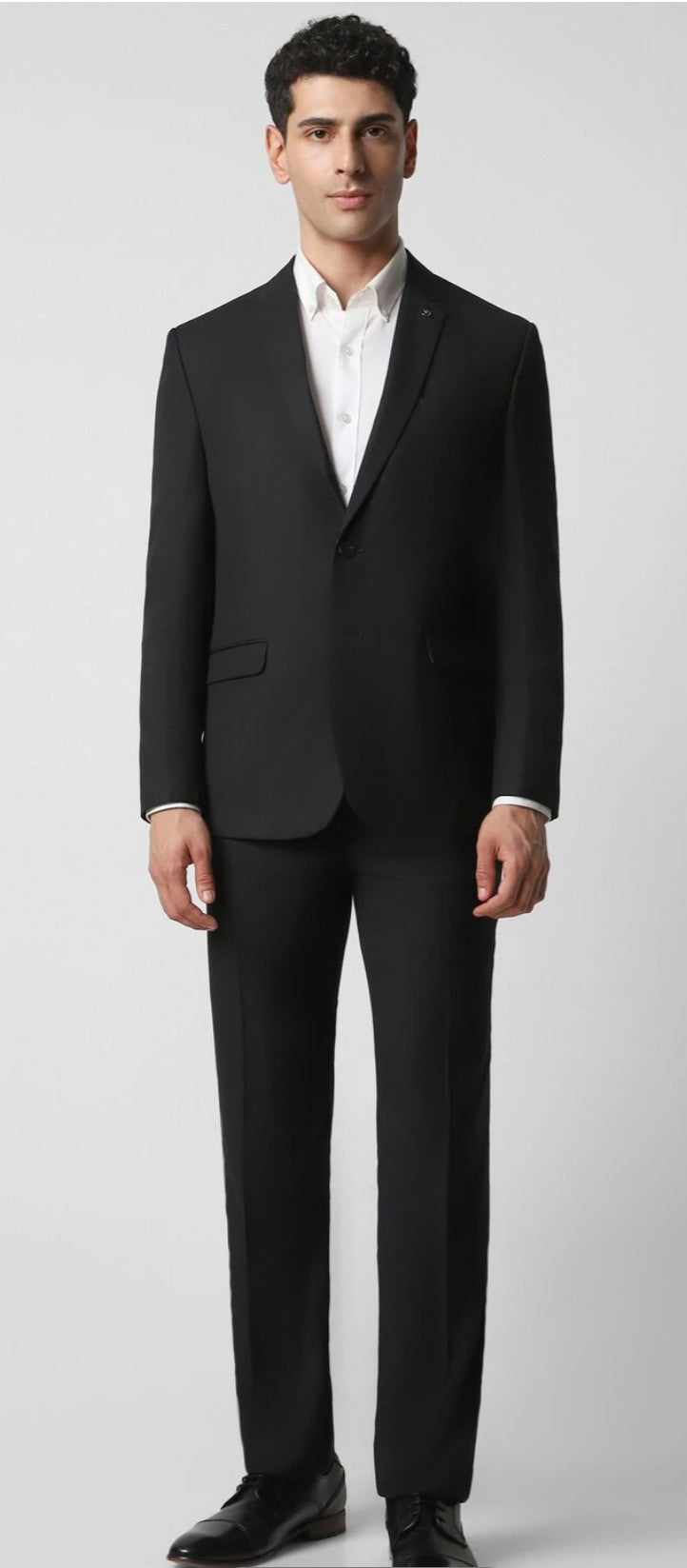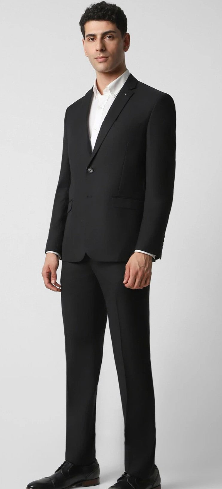 Elevate your formal attire with the Van Heusen two-piece suit in classic black. Crafted from a blend of terylene and rayon, this slim fit suit ensures both comfort and style, making it perfect for any sophisticated event.