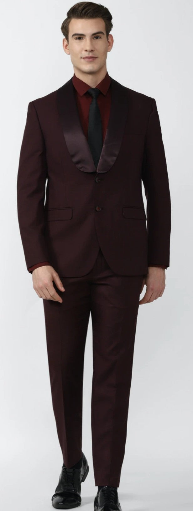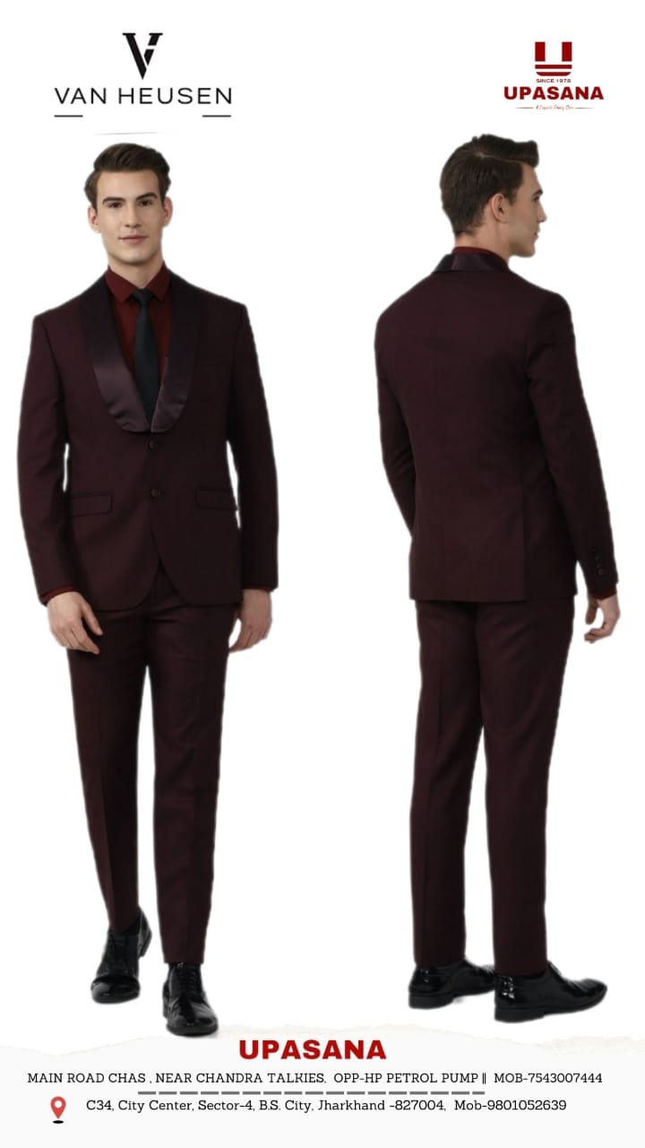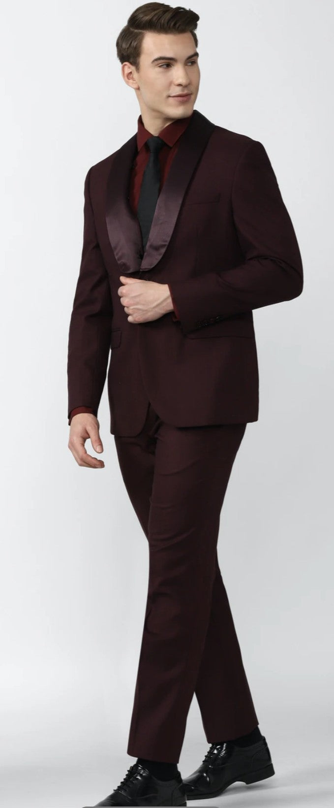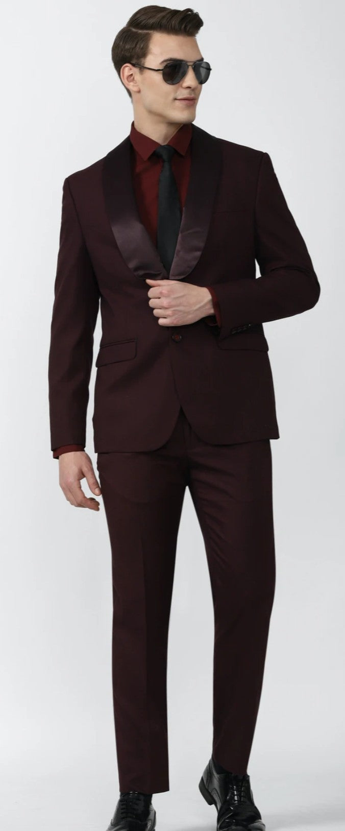 Elevate your wedding attire with the Van Heusen Two-Piece Suit in Maroon. Crafted from a luxurious blend of polyester, rayon, and spandex, this slim-fit suit features a sophisticated textured pattern that is sure to impress.